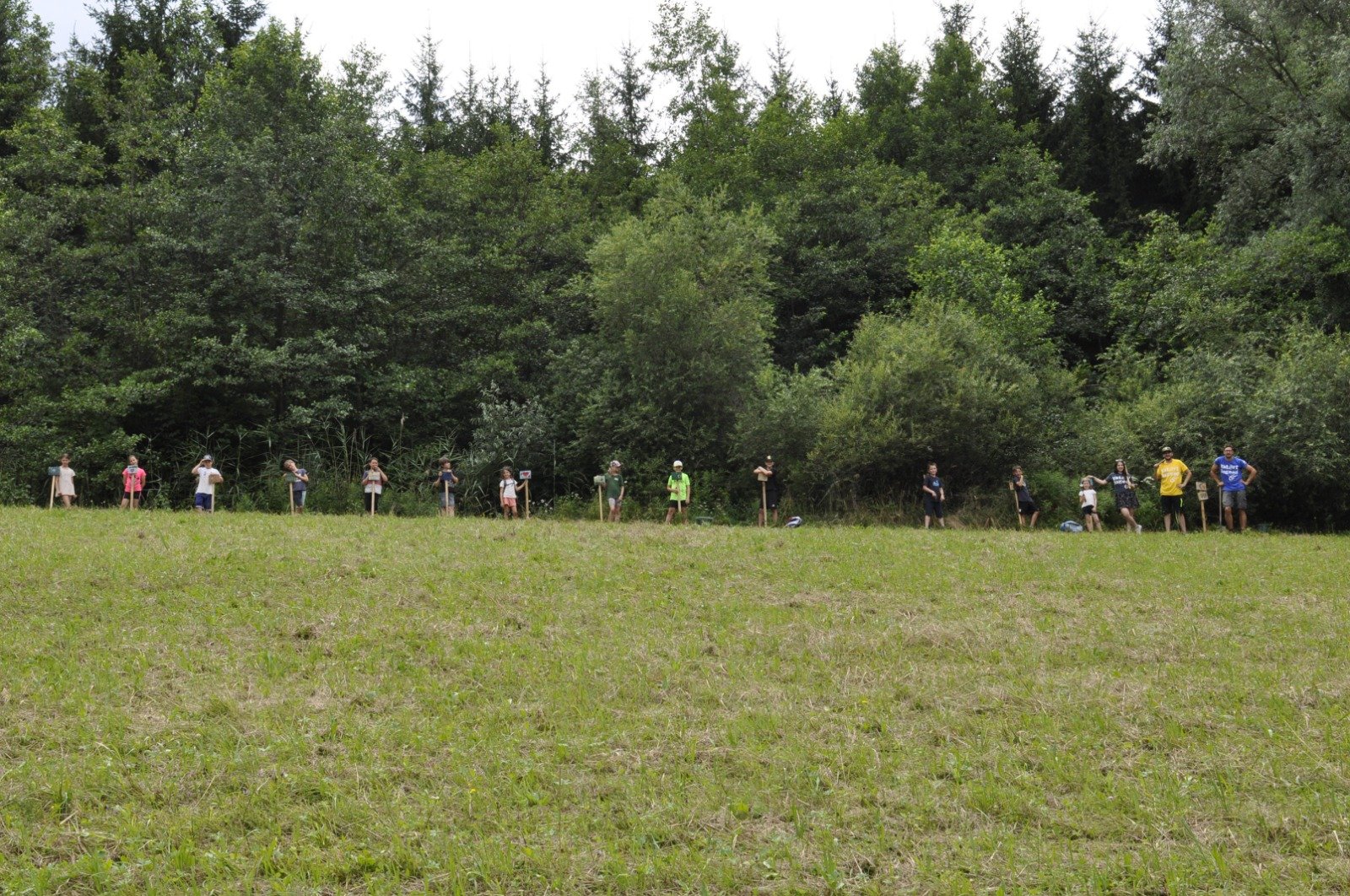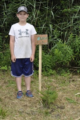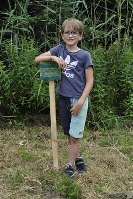Nachdem die ersten Forscher auch in diesen Mappen bereits viele Rätsel gelöst haben, durfte jede:r eine eigene kleine Holztafel bemalen und mit dem eigenen Namen versehen. Danach machten wir uns gestärkt zu Fuß auf den Weg zu einem zum Gelände gehörenden Waldrand. Vor Ort hat der Bezirksvorstand bereits Löcher und Holzpfähle sowie Setzlinge vorbereitet. Jedes Kind durfte dort seinen Baum einpflanzen und mit seinem individuellen Schild versehen. Ein Erinnerungsfoto davon wird diese Aktion für die Ewigkeit festhalten.