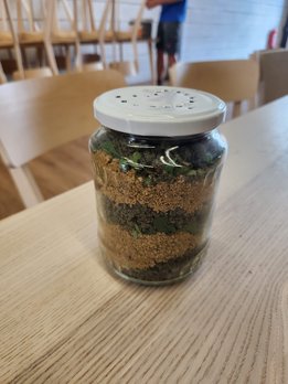 Ausklingen konnte der Mittwochnachmittag dann wieder in der Bioenergie Zentrale, wo bereits leere Gläser für Regenwurmaquarien vorbereitet waren. Beim Bäumesetzen konnten nämlich einige Regenwürmer gefunden werden, welche den Kindern dann als Bewohner für ihr Glas dienten. Mit verschiedenen Schichten, rund um Sand, Erde und Gras, wird nach einiger Zeit die Wichtigkeit der Würmer in der Natur ersichtlich. Die Erde wird laufend umgewälzt, sodass sich immer etwas tut und der Boden gut durchlüftet wird, somit werden die Pflanzenwurzeln gut mit Sauerstoff versorgt.